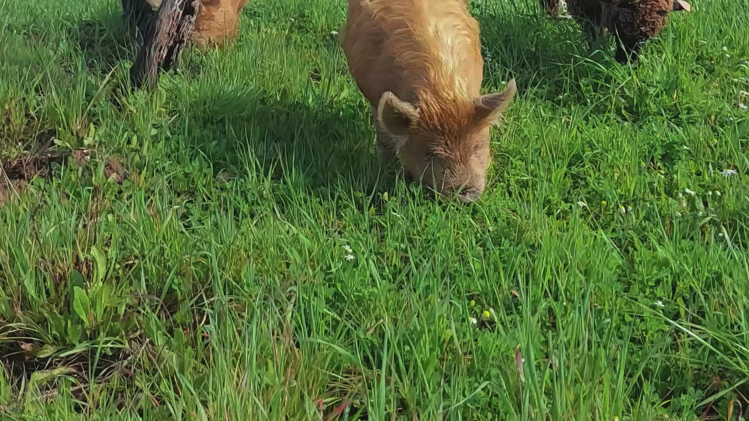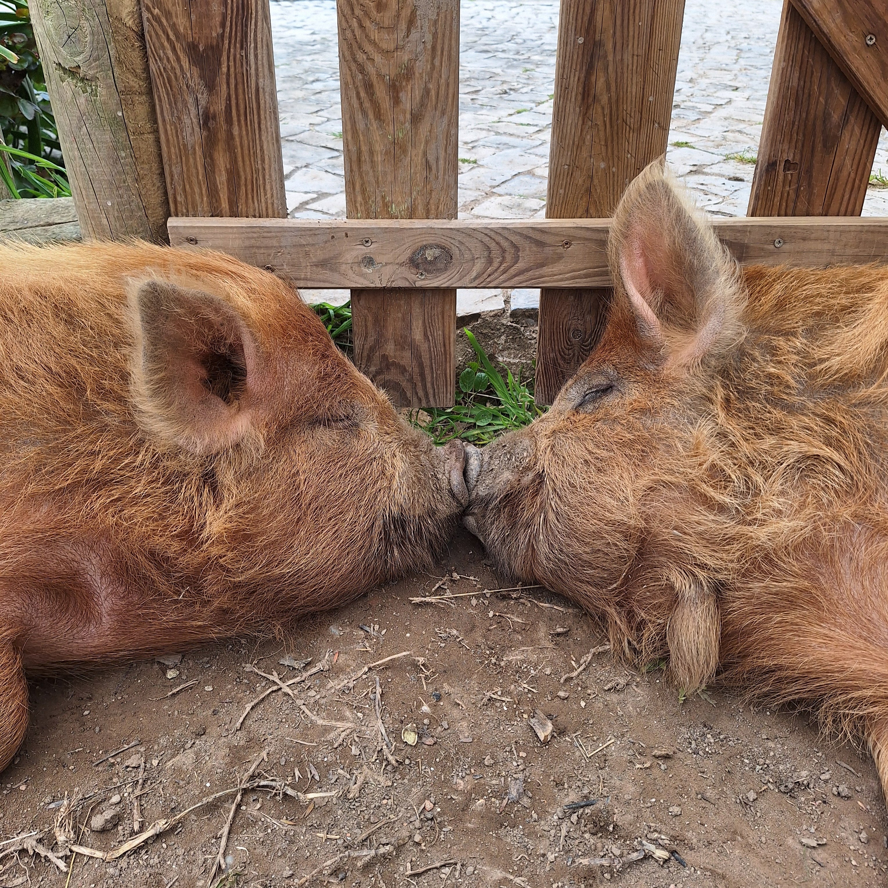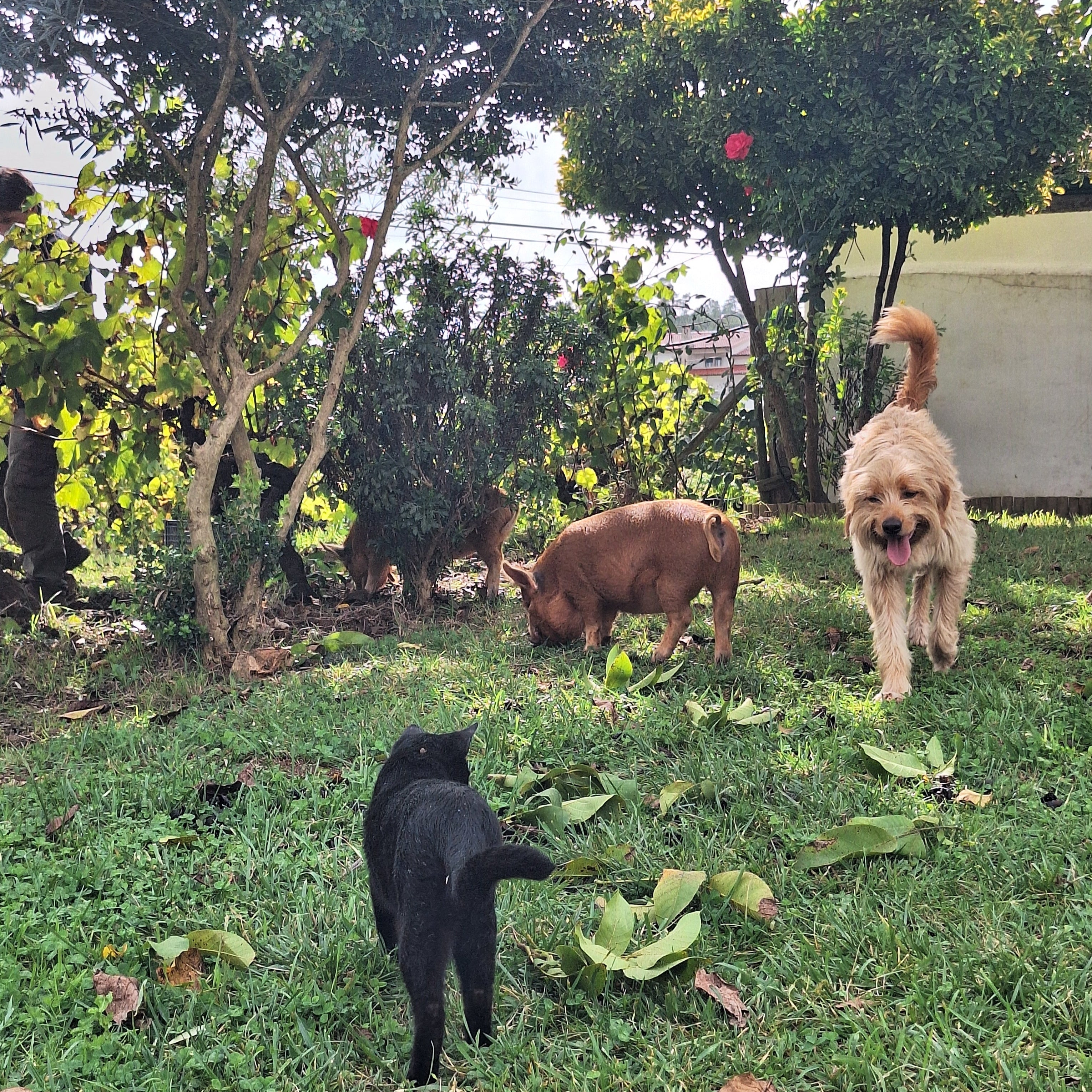 Temos dois cães sempre vigilantes, um gato curioso, duas ovelhas Merino pretas — uma raça nativa de Portugal — e dois porcos Kunekune, conhecidos pela sua natureza calma e excelentes capacidades de pastoreio.