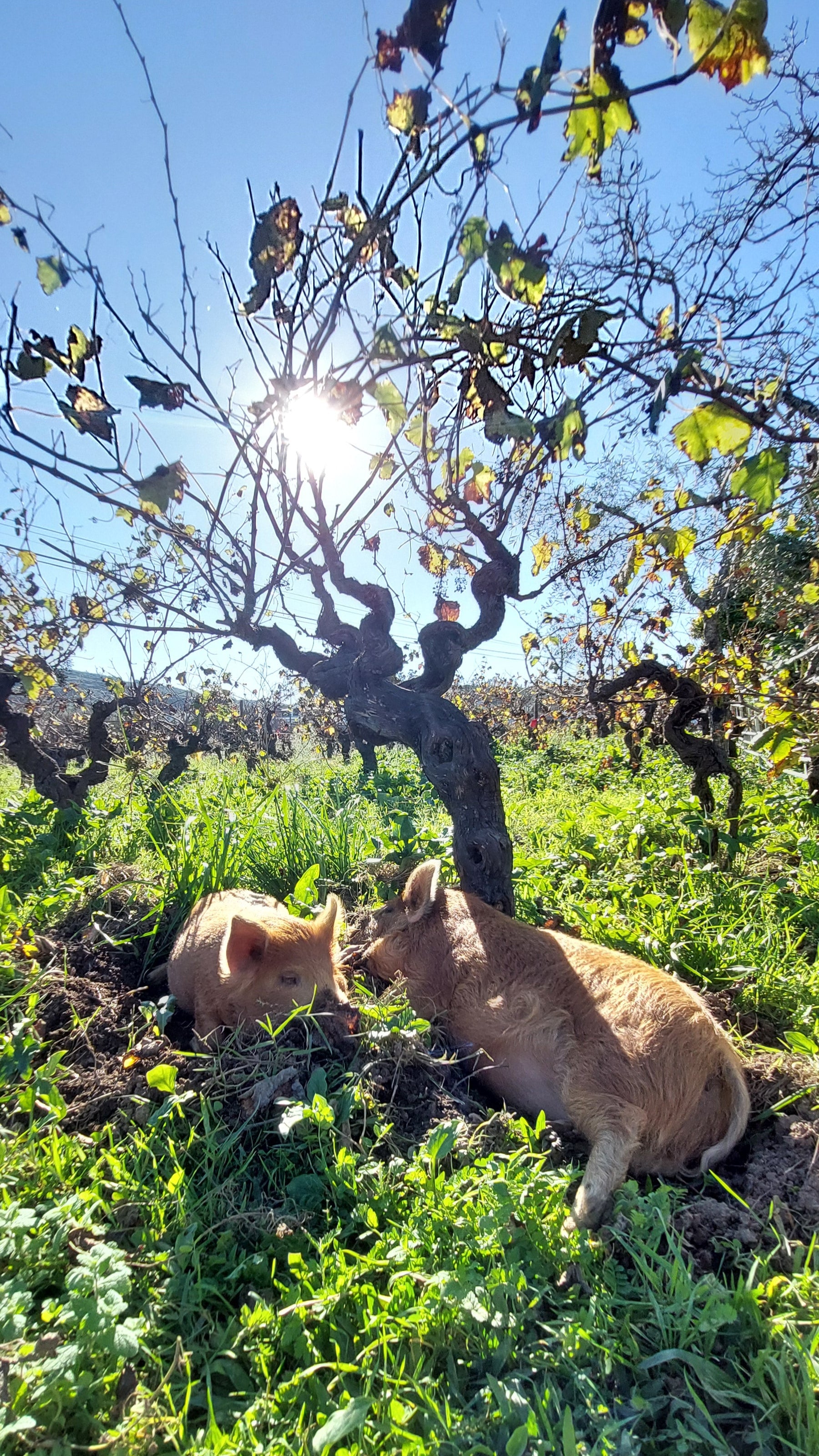 Durante cerca de metade do ano, estes animais vivem na vinha , onde ajudam a controlar naturalmente as ervas daninhas e a arejar o solo com os seus movimentos. Graças a este trabalho conjunto, reduzimos a necessidade de maquinaria pesada e não utilizamos herbicidas, promovendo um solo mais vivo e saudável.
